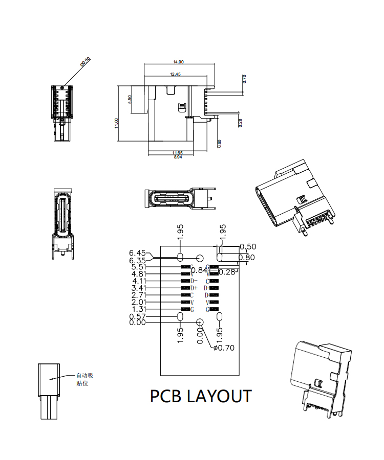 USB Type C Female PCB Connector 14P Vertical L11.0MM USB C Female Connector Product Item:U06-CF1A5R-093 Housing:LCP UL94V-0 Contact:Brass C2680-H Current Rating:3A~5A Dielectric Withstanding Voltage:300V AC/rms USB Type C Female PCB Connector 14P Vertical SMT Type L=110MM USB C Female Connector Inquiry Send Email Datasheet