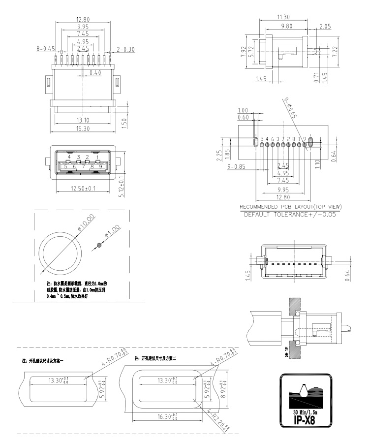 Vertical Dip Type IP68 Waterproof USB Connector 9P 3.0 USB A Female Connector Product Item:U03-AFXXXT-W006 Housing:PA10T Contact:C5210R-EH Current Rating:3A Dielectric Withstanding Voltage:100 V R.M.S. Vertical Dip Type IP68 Waterproof USB Connector 9Pin 30 USB A Female Connector Inquiry Send Email Datasheet