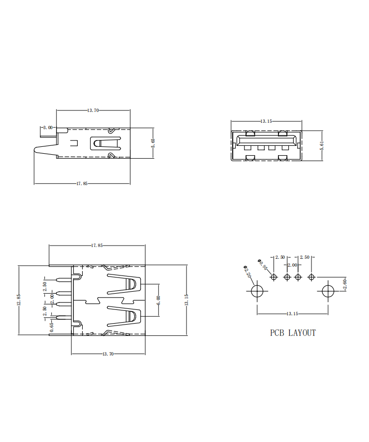 Vertical USB 2.0 A/F Connector 180 Degree 13.7MM 4Pin Type A USB Female PCB Connector Product Item:U02-AFXX5T-014 Housing:Hing Temperature Thermoplastics UL94V-O PBT White Contact:Copper Alloy Current Rating:1.5A Dielectric Withstanding Voltage:500V AC/rms Vertical USB 20 AF Connector 137MM 4Pin Type A USB Female PCB Connector Inquiry Send Email Datasheet